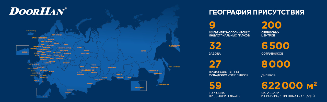 The international concern DoorHan is an industrial group of deeply integrated production enterprises, whose common goal is the comprehensive supply of complete solutions for industrial construction sites, private housing, as well as urban infrastructure and agriculture. All the solutions offered are made up entirely of DoorHan products, moreover, they are designed and manufactured at the own factories of the concern DoorHan.